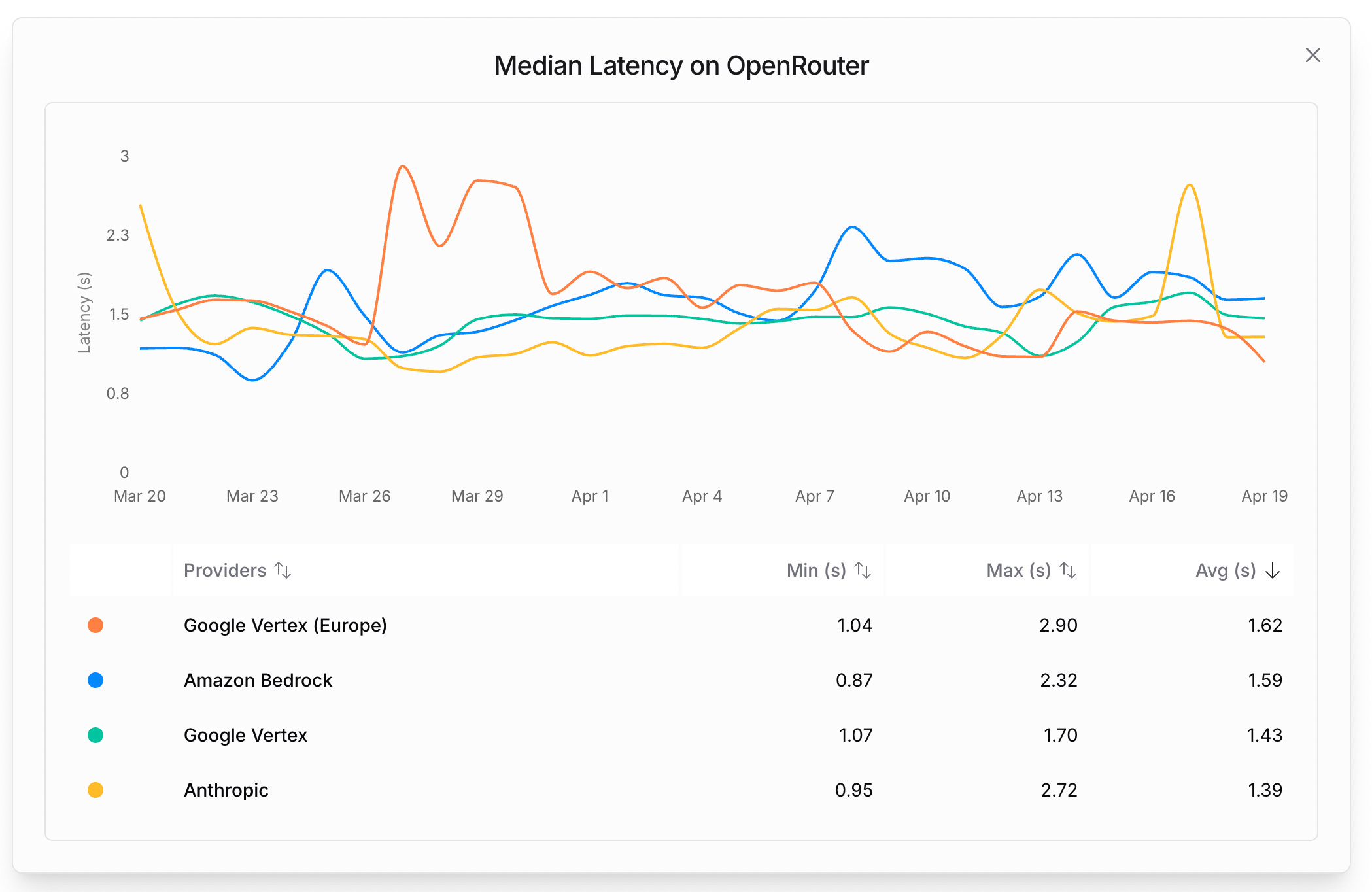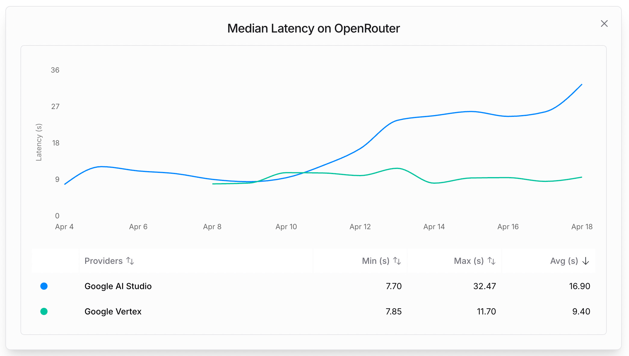 Neither Sonnet 3.7 nor Gemini 2.5 Pro announcements ever talked about latency, yet it’s a pretty crucial aspect when iterating quickly with an AI assistant. If we compare their stats on OpenRouter (a popular aggregator used by users of Cline, Roo Code, etc.), Gemini is averaging ~10-15sec, Sonnet ~1.5sec, and GPT4.1 is at a stunning 0.6sec.