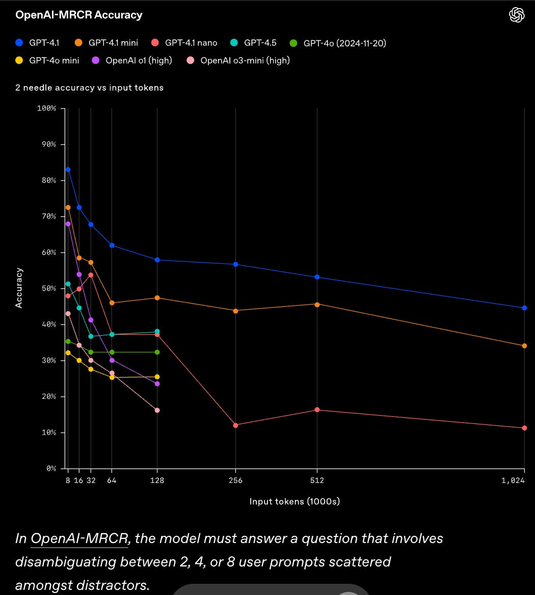 Speaking of context window, perhaps one of the most important charts that was shown in 4.1 announcement is how the model accuracy degrades with context window. Announcing “1M supported context window“ means nothing if your performance is at 60% after just 128k input tokens!