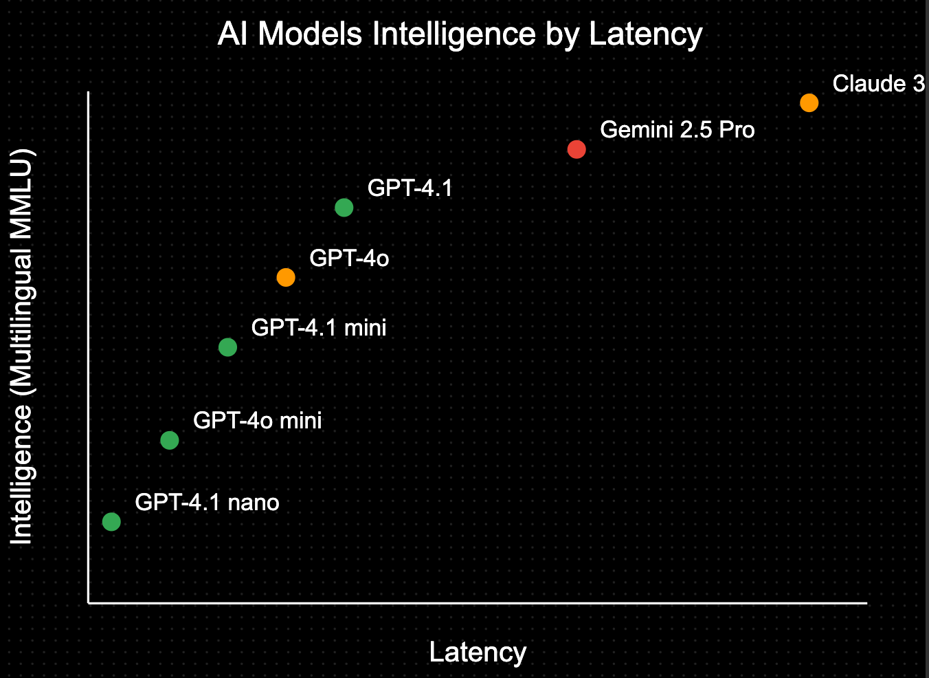 If we were to add other top models to the latency/intelligence graph, it would look something like this. To consider price difference, I’ve also added color-coded representation where green is cheap and red is expensive: