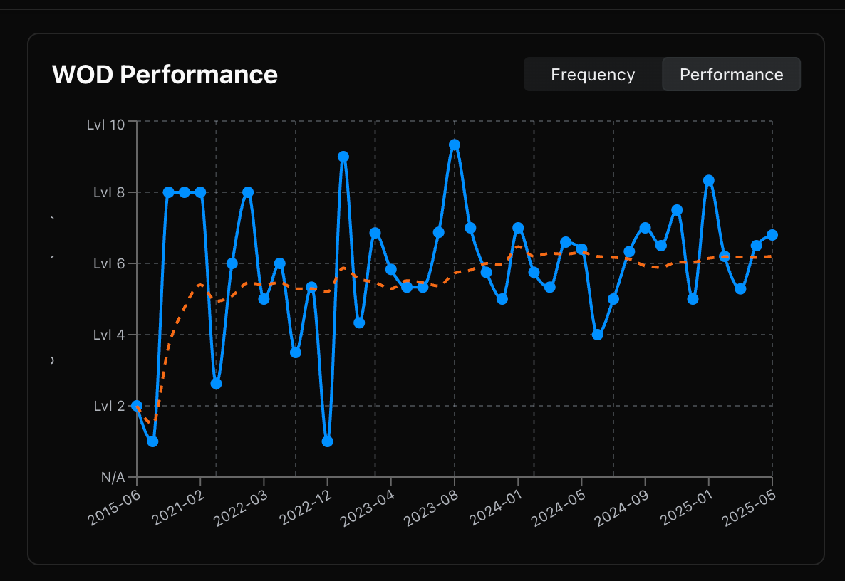 Once we know your performance levels on all the WOD’s, it’s easy to plot them over time for a chart like this that shows “fitness level” progression and trend. And here’s something even more fun — because we have WOD’s difficulty, we can adjust your score to be more representative of real life performance (meaning that getting “Intermediate” in a “Very Hard” WOD is closer to getting “Advanced“ in “Hard” one):