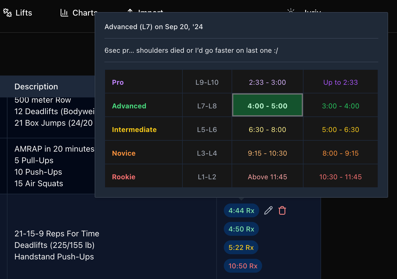 This makes calculations tricky but I think it’s still possible to create a range that resembles an averaged-out, close-enough representation. Our “5k run” results are likely more lax than the ones actual runners would use. But for most workouts, it’s possible to use reasoning to tell that 6 minute Fran is roughly a (top of) intermediate or a (bottom of) advanced.