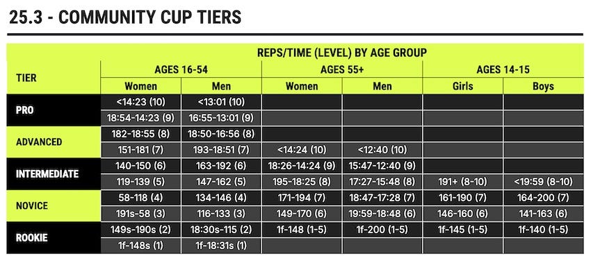 CrossFit popularized percentile-based scores during the Open, and — as part of Community Cup — they recently rolled out a scoring system that consists of 5 levels that map directly to percentiles — Rookie (<21%), Novice (22-43%), Intermediate (44-65%), Advanced (66-87%), and Pro (>88%).